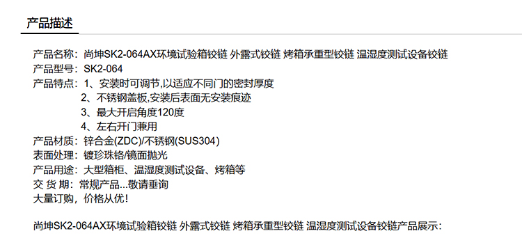 尚坤SK2-064AX环境试验箱铰链 外露式铰链 烤箱承重型铰链 温湿度测试设备铰链
