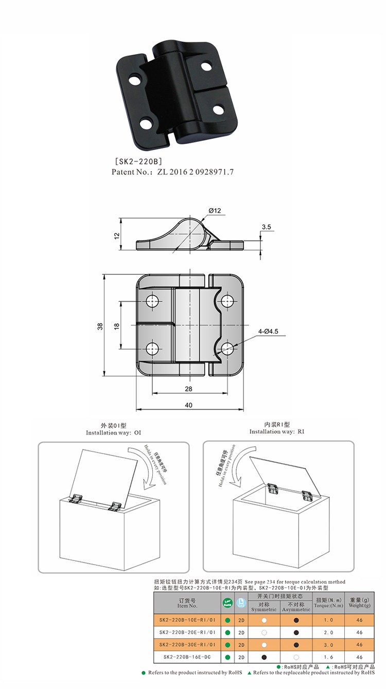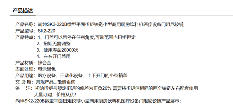 尚坤SK2-220B微型平面扭矩铰链小型商用厨房饮料机医疗设备门阻尼铰链