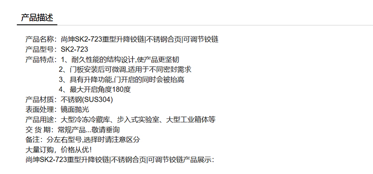 尚坤SK2-723重型升降铰链不锈钢合页可调节铰链