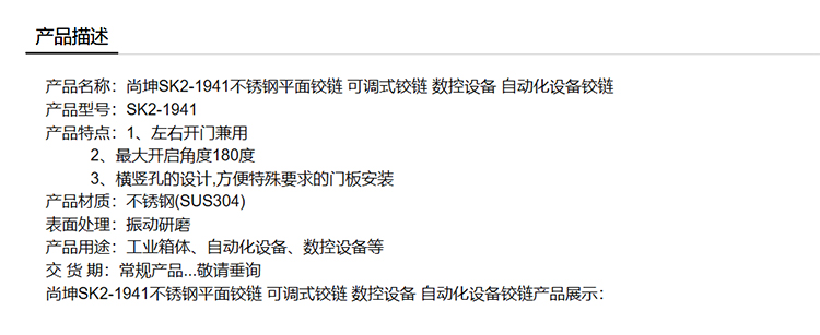 尚坤SK2-1941不锈钢平面铰链 可调式铰链 数控设备 自动化设备铰链