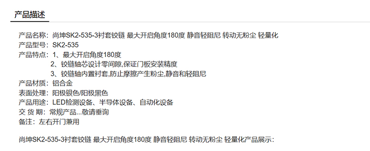 尚坤SK2-535-3衬套铰链 最大开启角度180度 静音轻阻尼 转动无粉尘 轻量化