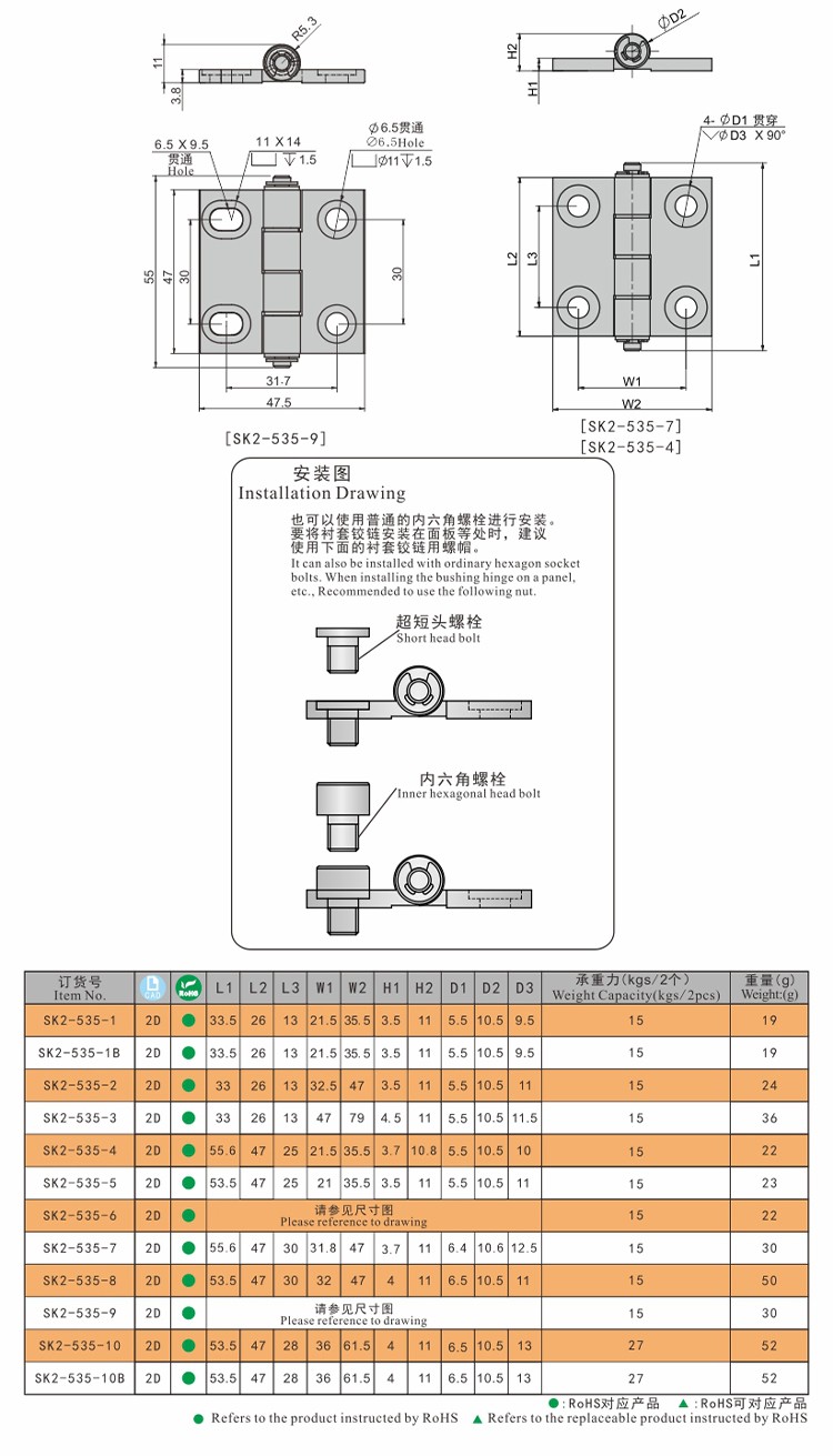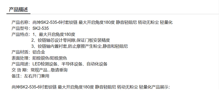 尚坤SK2-535-6衬套铰链 最大开启角度180度 静音轻阻尼 转动无粉尘 轻量化