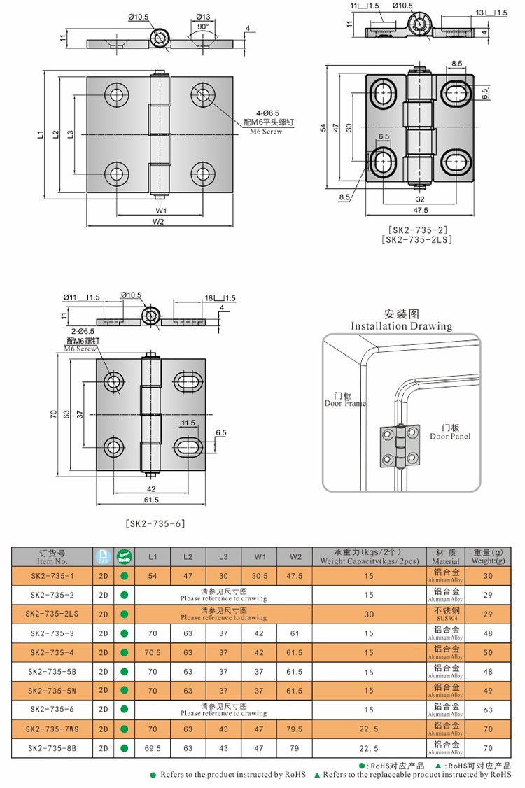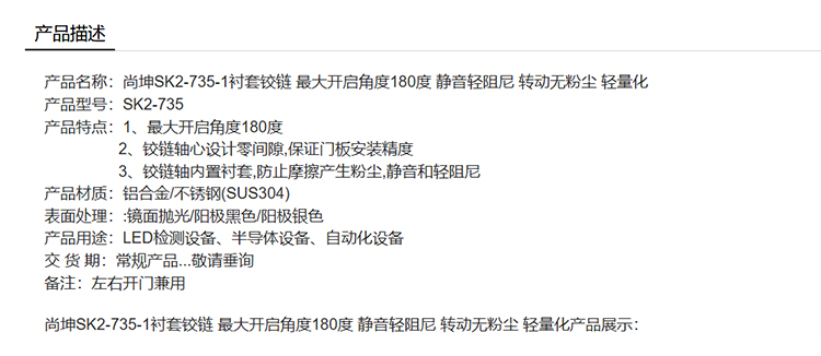 尚坤SK2-735-1衬套铰链 最大开启角度180度 静音轻阻尼 转动无粉尘 轻量化