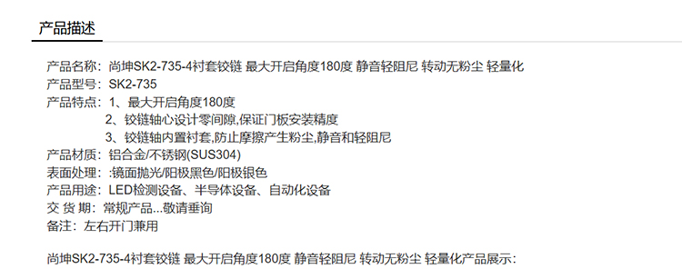 尚坤SK2-735-4衬套铰链 最大开启角度180度 静音轻阻尼 转动无粉尘 轻量化