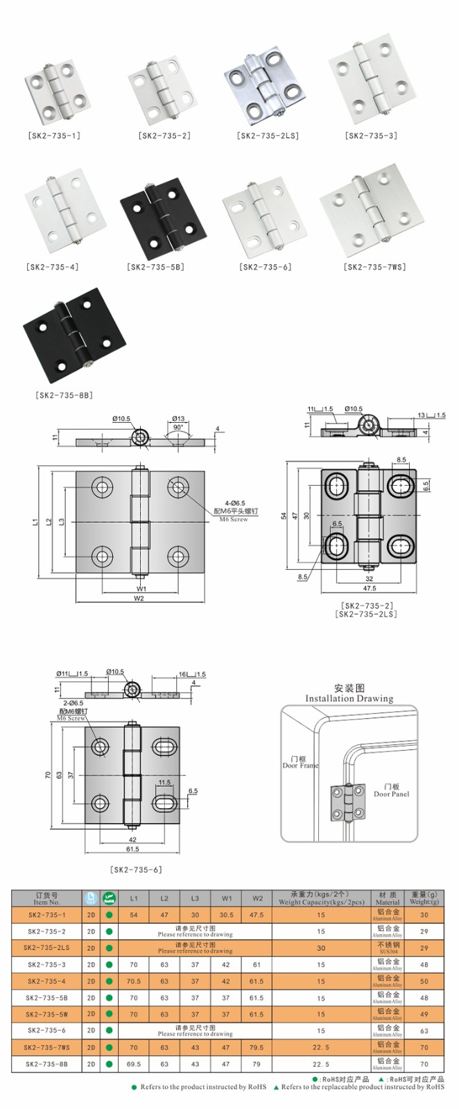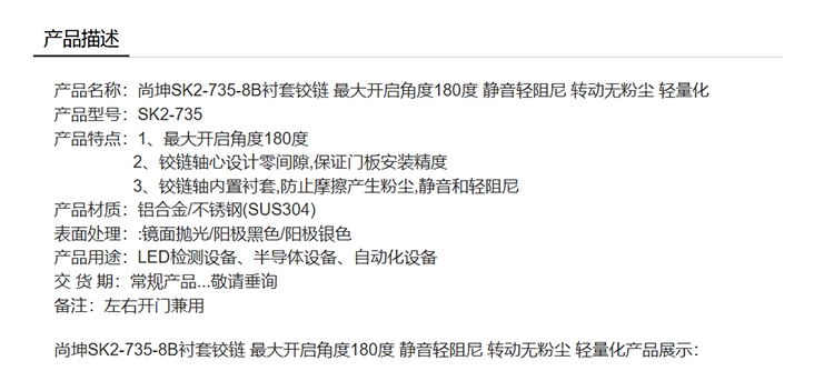 尚坤SK2-735-8B衬套铰链 最大开启角度180度 静音轻阻尼 转动无粉尘 轻量化