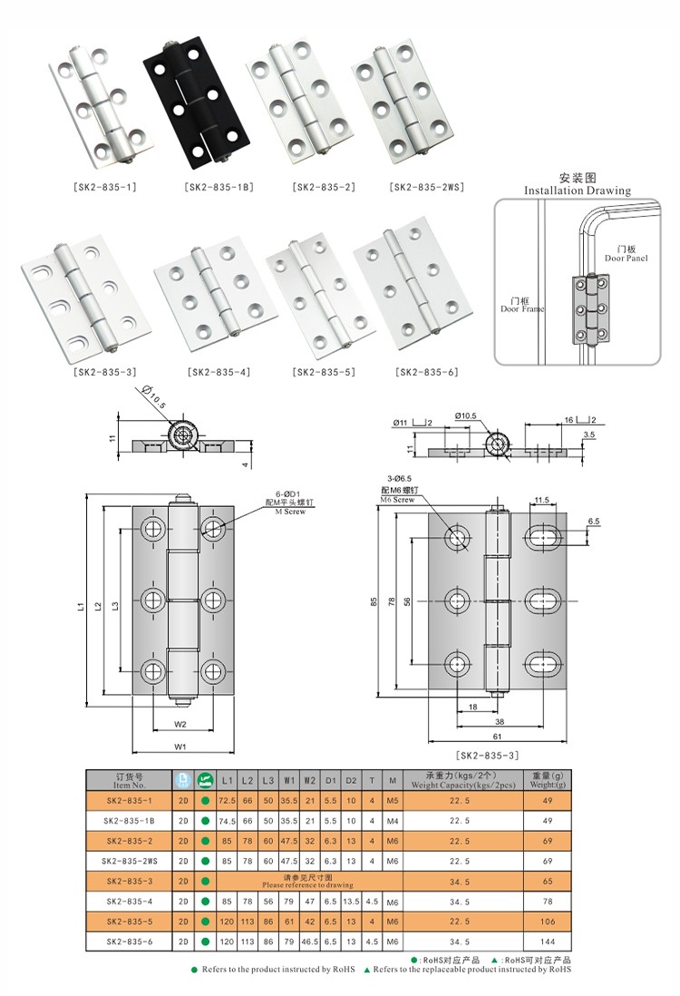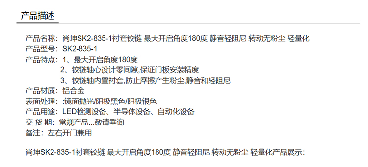 尚坤SK2-835-1衬套铰链 最大开启角度180度 静音轻阻尼 转动无粉尘 轻量化