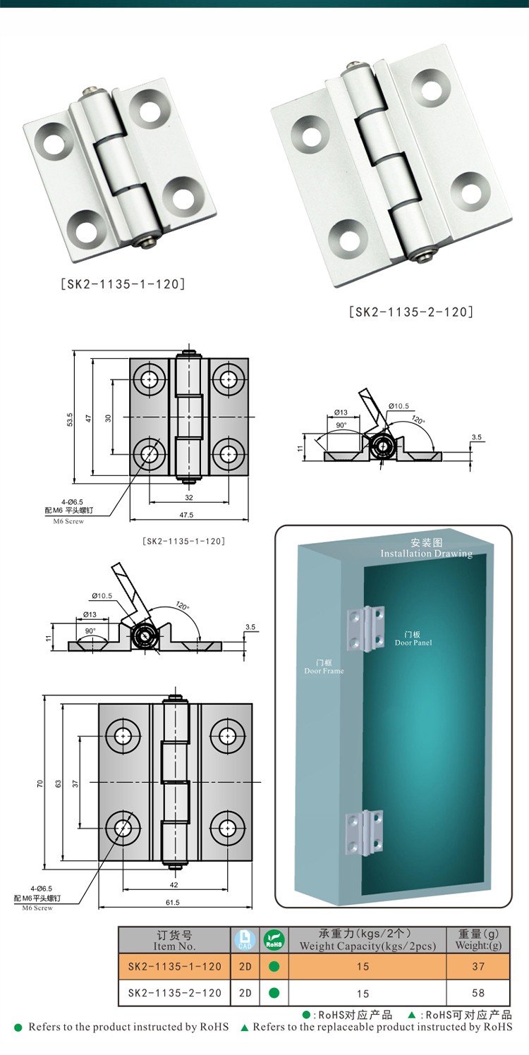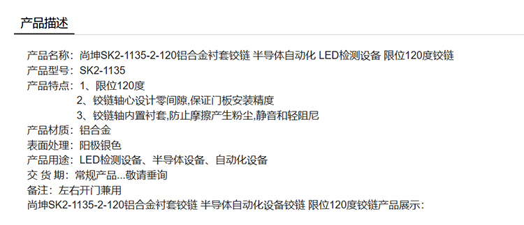 尚坤SK2-1135-2-120铝合金衬套铰链 半导体自动化 LED检测设备 限位120度铰链
