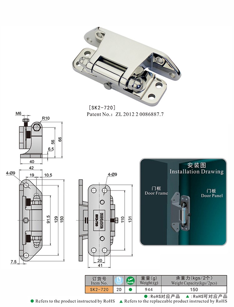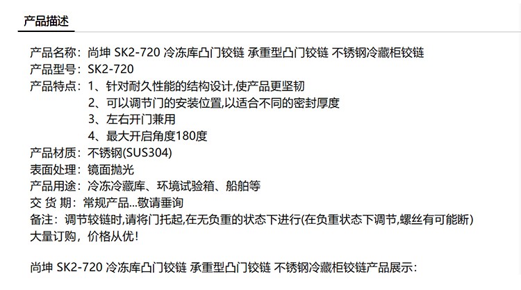 尚坤 SK2-720 冷冻库凸门铰链 承重型凸门铰链 不锈钢冷藏柜铰链