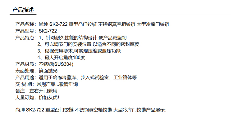 尚坤 SK2-722 重型凸门铰链 不锈钢真空箱铰链 大型冷库门铰链