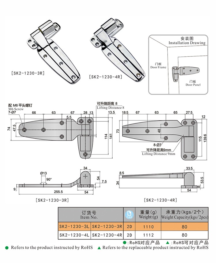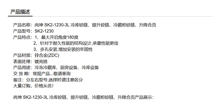尚坤 SK2-1230-3L 冷库铰链、提升铰链、冷藏柜铰链、升降合页