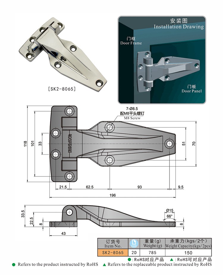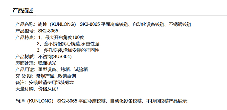 尚坤(KUNLONG) SK2-8065 平面冷库铰链、自动化设备铰链、不锈钢铰链