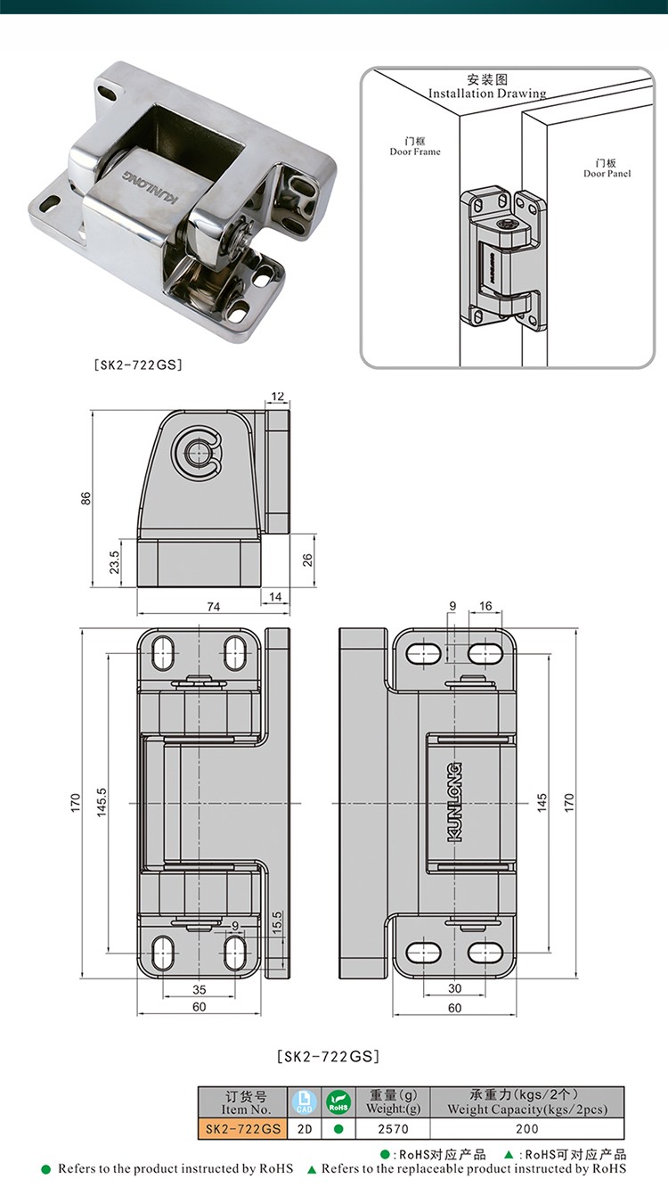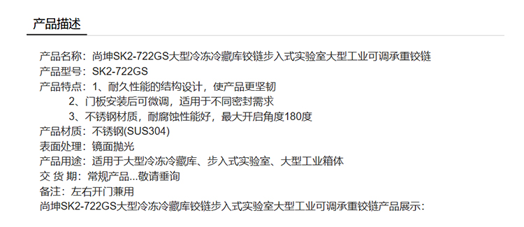 尚坤SK2-722GS大型冷冻冷藏库铰链步入式实验室大型工业可调承重铰链