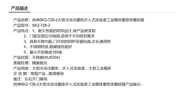 尚坤SK2-728-2大型冷冻冷藏库步入式实验室工业箱体重型承重铰链