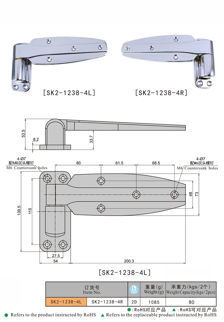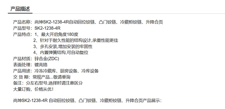 尚坤SK2-1238-4R 自动回位铰链、凸门铰链、冷藏柜铰链、升降合页