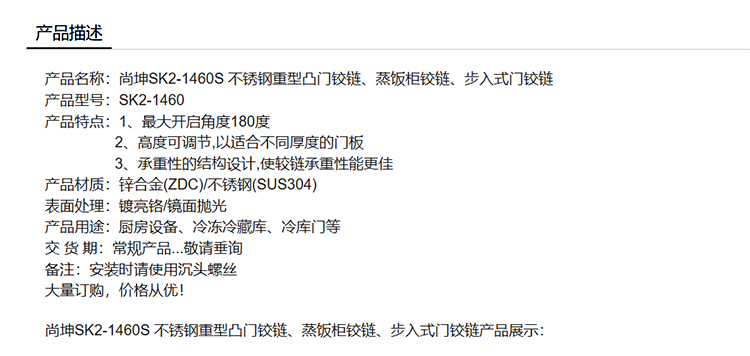 尚坤SK2-1460S 不锈钢重型凸门铰链、蒸饭柜铰链、步入式门铰链