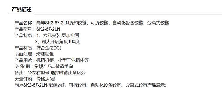 尚坤 SK2-67-2LN 拆卸铰链、可拆铰链、自动化设备铰链、分离式铰链