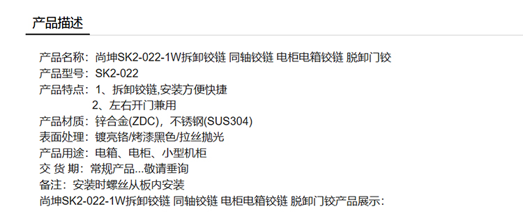 尚坤SK2-022-1W 拆卸铰链 同轴铰链 电柜电箱铰链 脱卸门铰