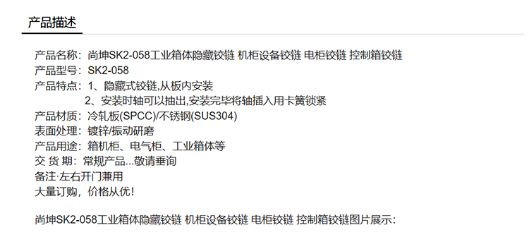 尚坤(KUNLONG) SK2-058 隐藏铰链、机柜铰链、电柜铰链、控制箱铰链