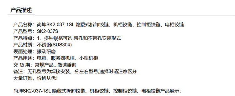 尚坤SK2-037-1SL 隐藏式拆卸铰链、机柜铰链、控制柜铰链、电柜铰链