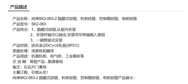 尚坤SK2-063-2 隐藏式铰链、机柜铰链、控制箱铰链、电柜铰链