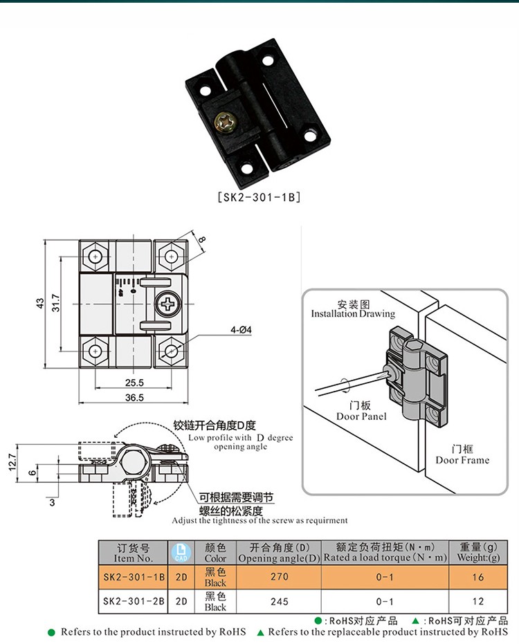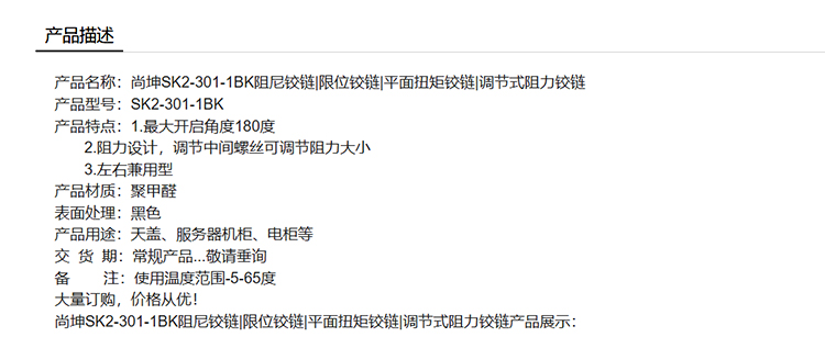 尚坤SK2-301-1BK阻尼铰链限位铰链平面扭矩铰链调节式阻力铰链