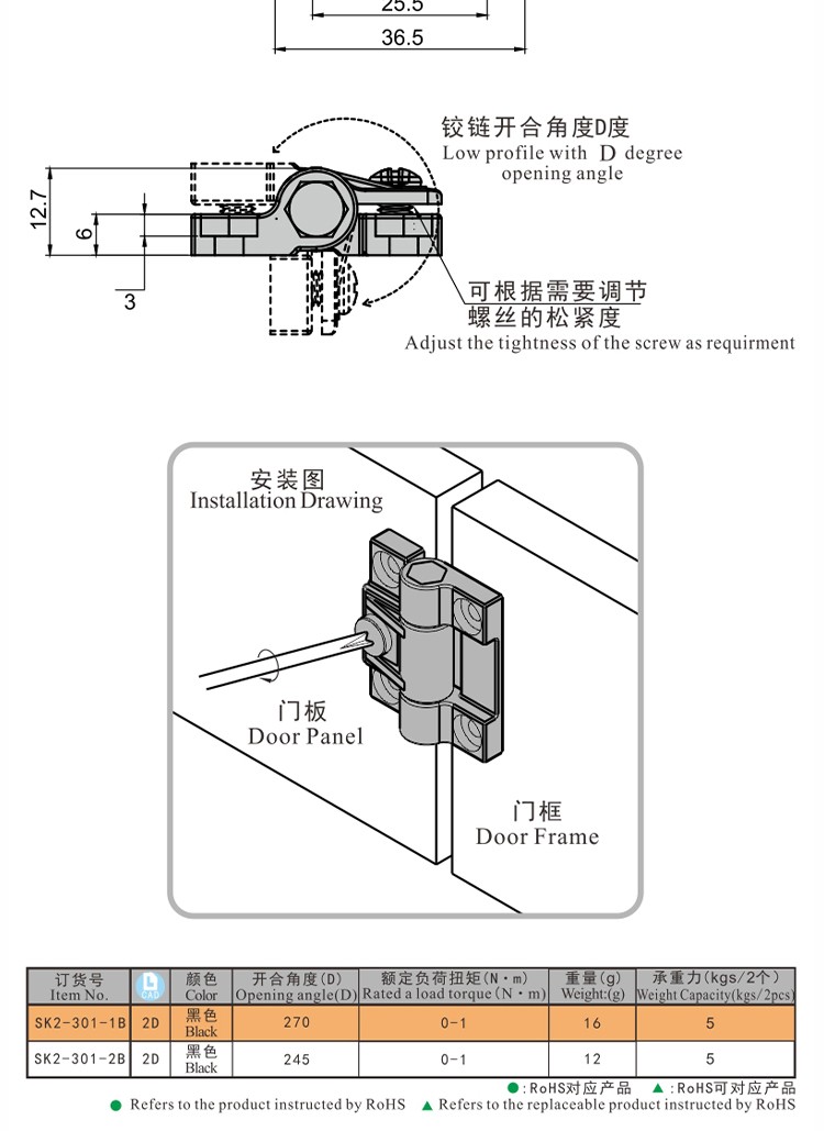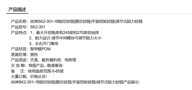 尚坤SK2-301-1B阻尼铰链限位铰链平面扭矩铰链调节式阻力铰链