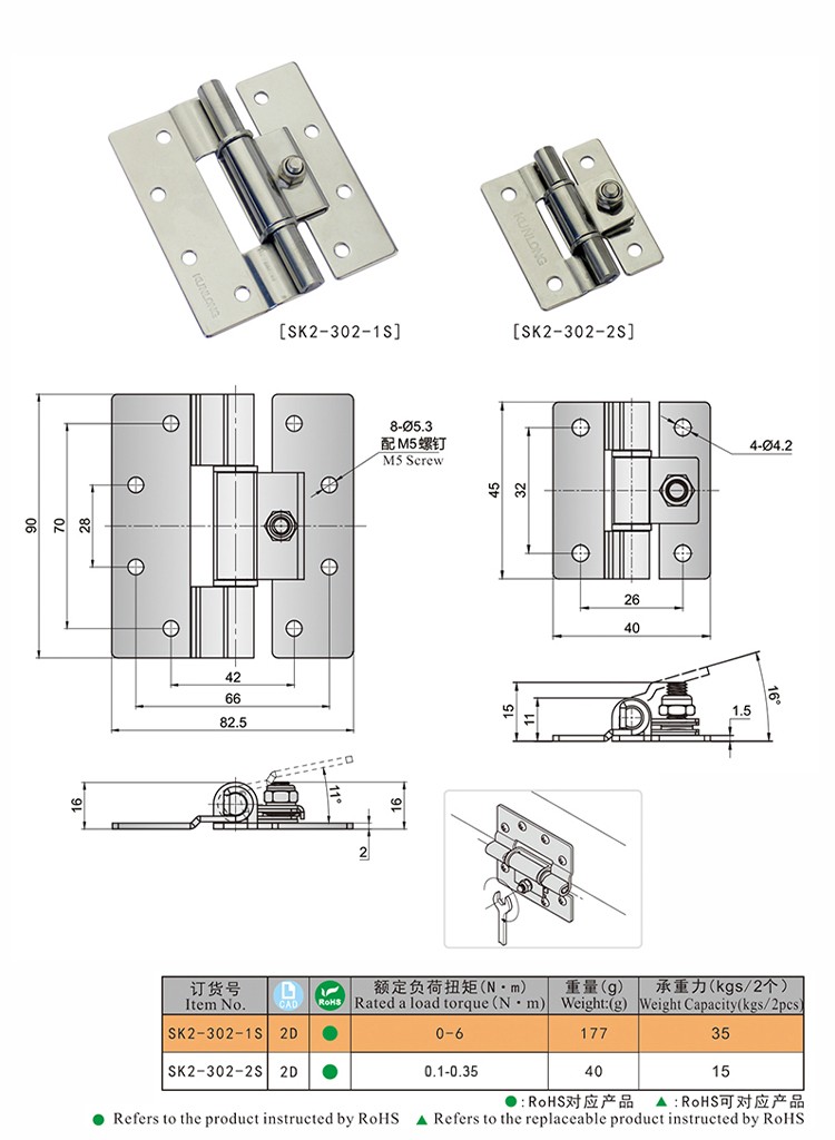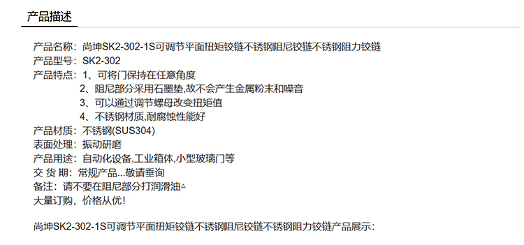 尚坤SK2-302-1S可调节平面扭矩铰链不锈钢阻尼铰链不锈钢阻力铰链