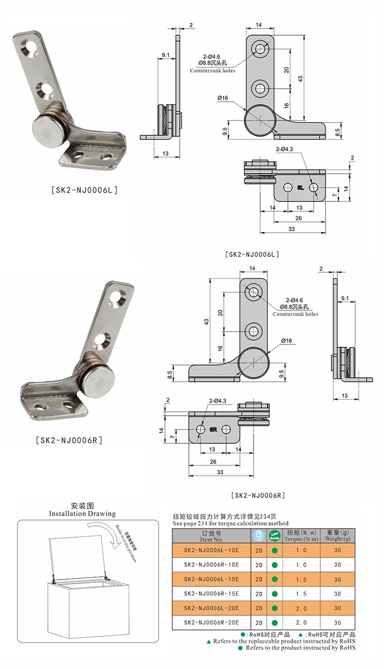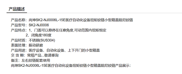 尚坤SK2-NJ0006L-15E医疗自动化设备扭矩铰链小型箱盖阻尼铰链