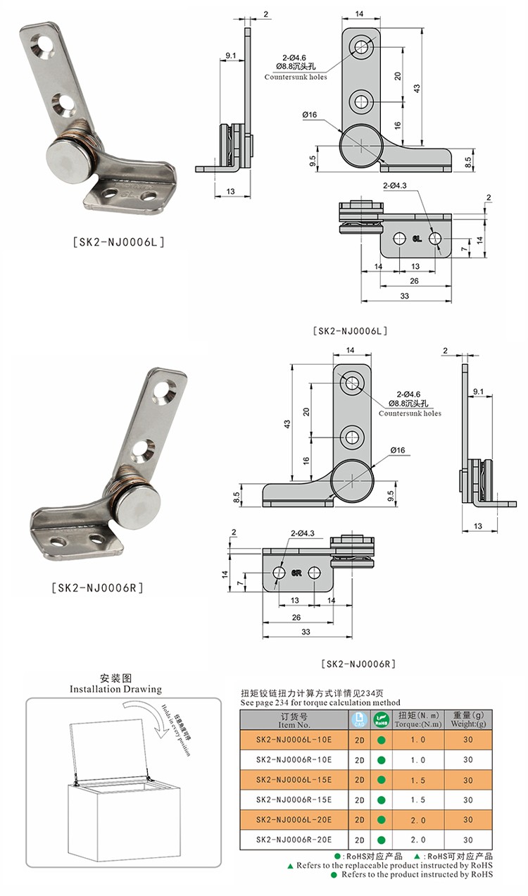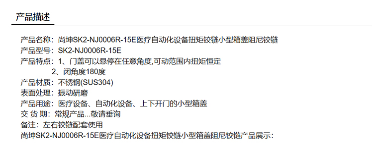 尚坤SK2-NJ0006R-15E医疗自动化设备扭矩铰链小型箱盖阻尼铰链