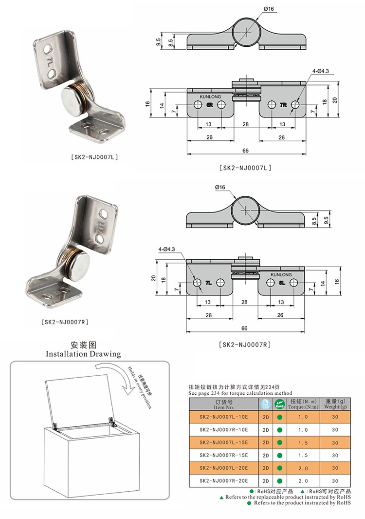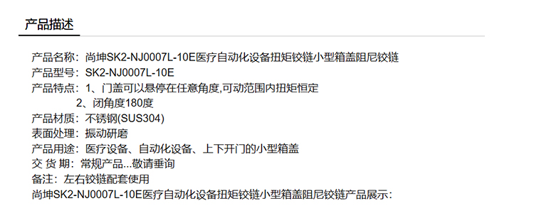 尚坤SK2-NJ0007L-10E医疗自动化设备扭矩铰链小型箱盖阻尼铰链