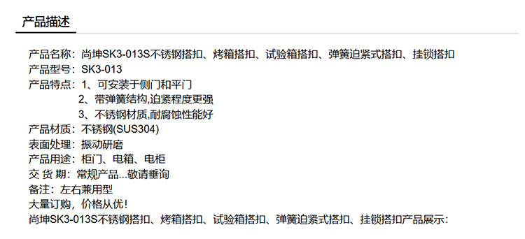 尚坤SK3-013S不锈钢搭扣、烤箱搭扣、试验箱搭扣、弹簧迫紧式搭扣、挂锁搭扣
