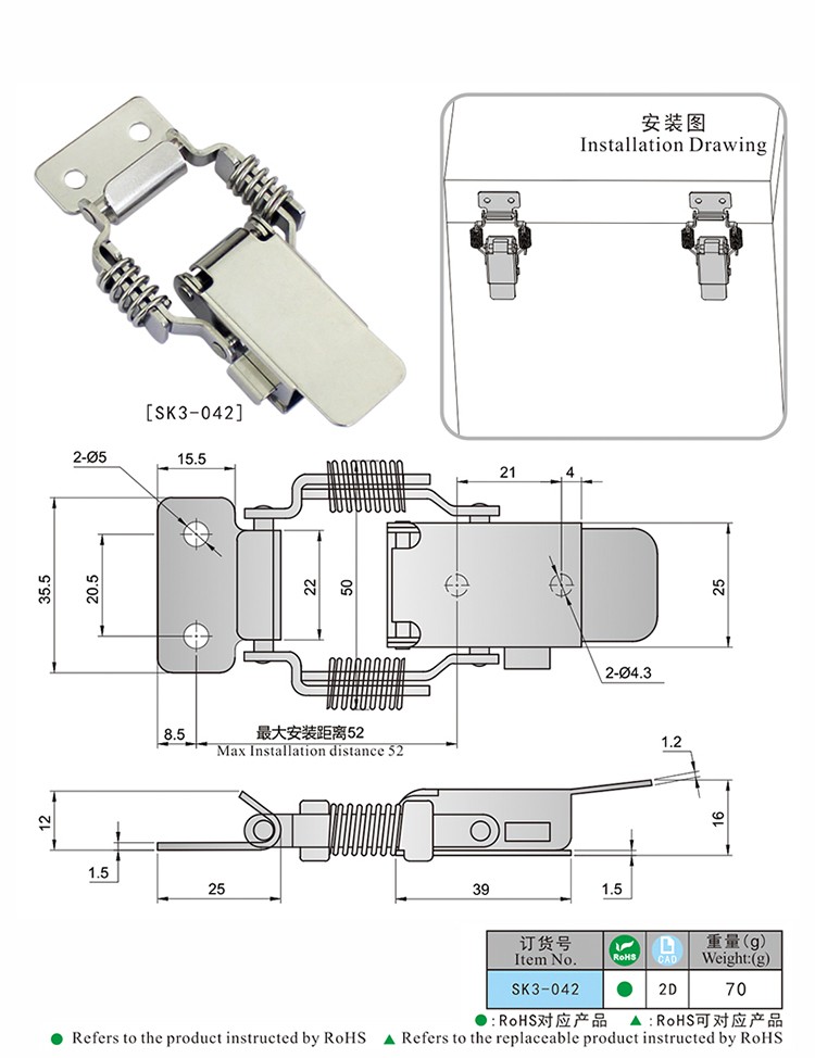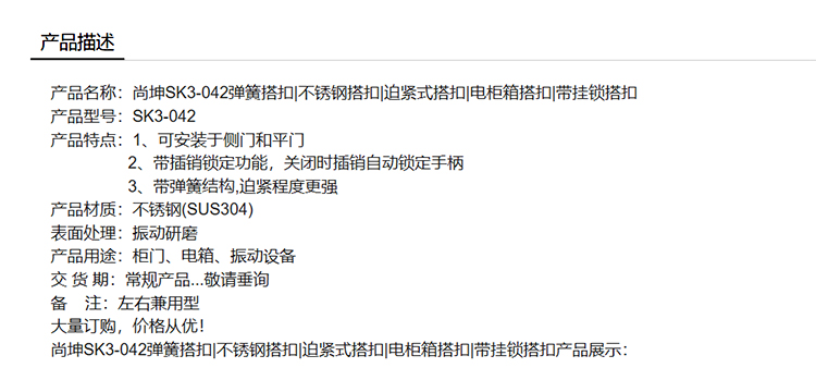 尚坤SK3-042弹簧搭扣不锈钢搭扣迫紧式搭扣电柜箱搭扣带挂锁搭扣