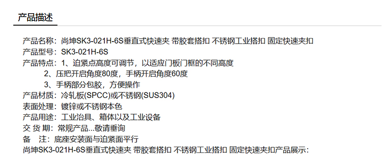 尚坤SK3-021H-6S垂直式快速夹 带胶套搭扣 不锈钢工业搭扣 固定快速夹扣
