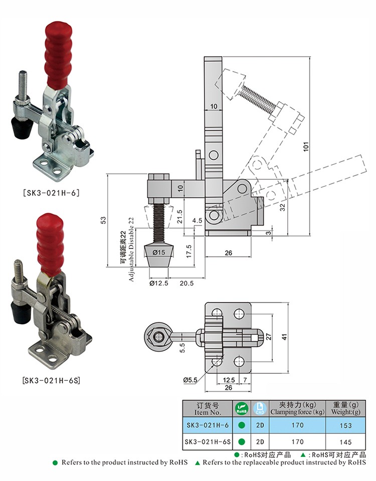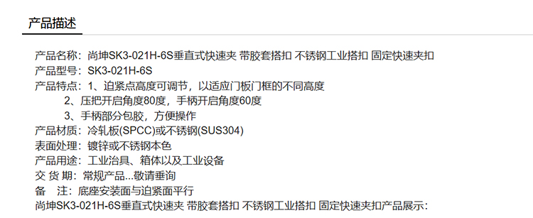 尚坤SK3-021H-6S垂直式快速夹 带胶套搭扣 不锈钢工业搭扣 固定快速夹扣